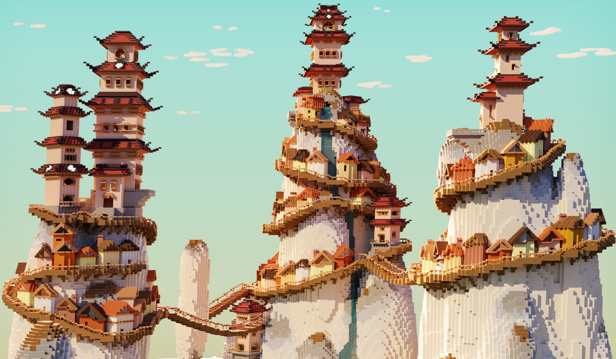 This map is a spawn designed for sale as part of a bundle including skins, models, and spawn functions for the Minecraft Marketplace. It features three mountains connected by suspension bridges, with villager cabins scattered throughout the mountainsides and temples positioned at the summit of each peak. The map is packed with hidden secrets, including parkour challenges, concealed treasure chests, and NPCs with interactive functionalities.